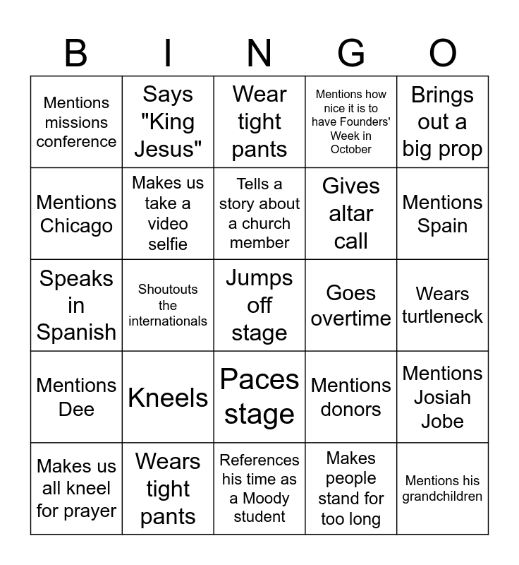 This bingo card has a free space and 24 words: Kneels, Wears tight pants, Tells a story about a church member, Makes us all kneel for prayer, Brings out a big prop, Mentions missions conference, Mentions Chicago, Says "King Jesus", Goes overtime, Paces stage, Gives altar call, Speaks in Spanish, Mentions donors, Mentions Josiah Jobe, Makes us take a video selfie, Makes people stand for too long, Wears turtleneck, Wear tight pants, Mentions Spain, Shoutouts the internationals, Mentions his grandchildren, Mentions Dee, Mentions how nice it is to have Founders' Week in October and References his time as a Moody student.