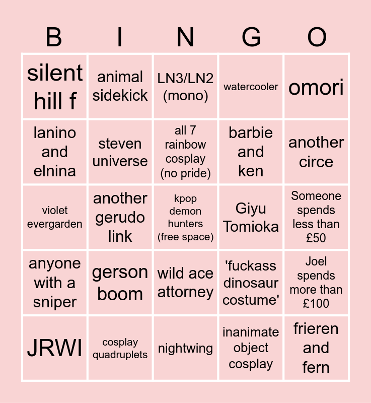 This bingo card has a free space and 24 words: gerson boom, cosplay quadruplets, all 7 rainbow cosplay (no pride), JRWI, omori, silent hill f, lanino and elnina, animal sidekick, Giyu Tomioka, wild ace attorney, barbie and ken, violet evergarden, 'fuckass dinosaur costume', Joel spends more than £100, steven universe, inanimate object cosplay, Someone spends less than £50, LN3/LN2 (mono), another circe, another gerudo link, frieren and fern, anyone with a sniper, watercooler and nightwing.