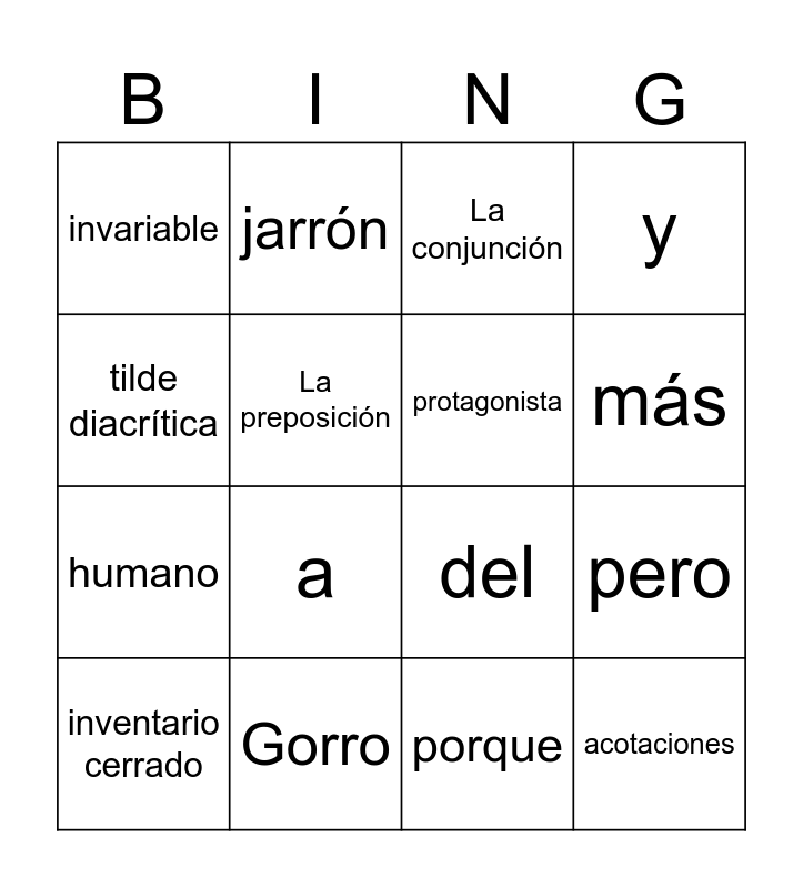 This bingo card has 16 words: Gorro, pero, La conjunción, invariable, humano, jarrón, del, porque, tilde diacrítica, La preposición, inventario cerrado, y, a, más, protagonista and acotaciones.