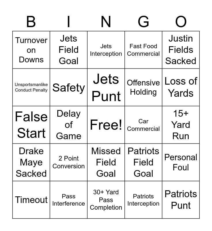 This bingo card has a free space and 24 words: 2 Point Conversion, Pass Interference, Jets Punt, Timeout, Justin Fields Sacked, Turnover on Downs, Unsportsmanlike Conduct Penalty, Jets Field Goal, Car Commercial, Missed Field Goal, Offensive Holding, False Start, Patriots Field Goal, Personal Foul, Safety, Patriots Interception, 15+ Yard Run, Jets Interception, Loss of Yards, Delay of Game, Patriots Punt, Drake Maye Sacked, Fast Food Commercial and 30+ Yard Pass Completion.
