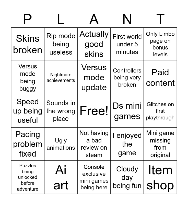 This bingo card has a free space and 24 words: Ugly animations, Ai art, Versus mode update, Puzzles being unlocked before adventure, Only Limbo page on bonus levels, Skins broken, Versus mode being buggy, Rip mode being useless, Ds mini games, Not having a bad review on steam, Controllers being very broken, Speed up being useful, I enjoyed the game, Mini game missing from original, Nightmare achievements, Cloudy day being fun, Glitches on first playthrough, Actually good skins, Paid content, Sounds in the wrong place, Item shop, Pacing problem fixed, First world under 5 minutes and Console exclusive mini games being here.