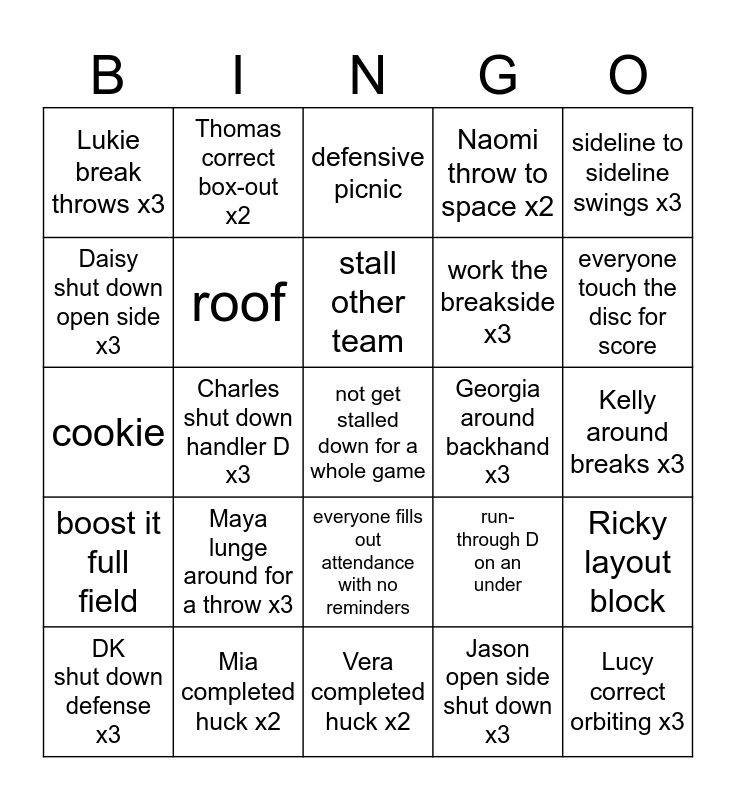 This bingo card has a free space and 24 words: Maya lunge around for a throw x3, Mia completed huck x2, stall other team, DK shut down defense x3, sideline to sideline swings x3, Lukie break throws x3, Daisy shut down open side x3, Thomas correct box-out x2, Georgia around backhand x3, everyone fills out attendance with no reminders, work the breakside x3, cookie, run-through D on an under, Ricky layout block, roof, Jason open side shut down x3, Kelly around breaks x3, defensive picnic, everyone touch the disc for score, Charles shut down handler D x3, Lucy correct orbiting x3, boost it full field, Naomi throw to space x2 and Vera completed huck x2.