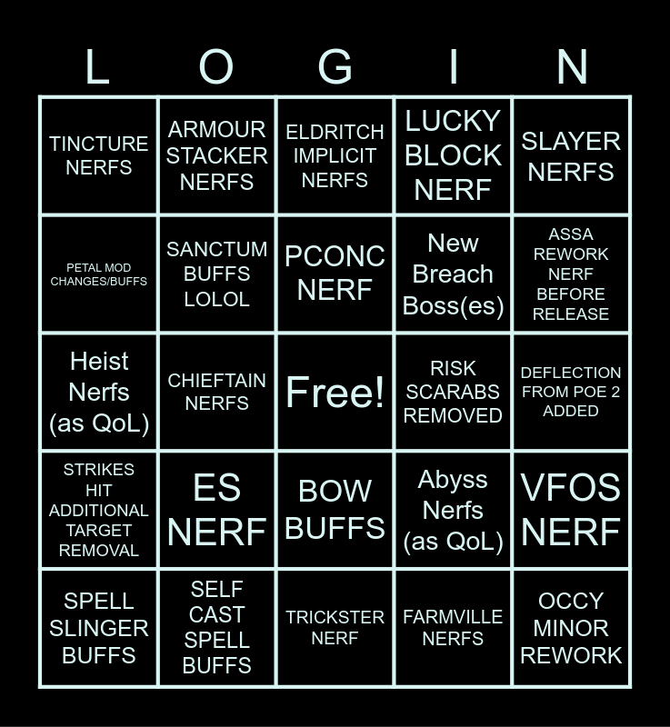 This bingo card has a free space and 24 words: ES NERF, SELF CAST SPELL BUFFS, PCONC NERF, SPELL SLINGER BUFFS, SLAYER NERFS, TINCTURE NERFS, PETAL MOD CHANGES/BUFFS, ARMOUR STACKER NERFS, RISK SCARABS REMOVED, BOW BUFFS, New Breach Boss(es), Heist Nerfs (as QoL), Abyss Nerfs (as QoL), VFOS NERF, SANCTUM BUFFS LOLOL, FARMVILLE NERFS, DEFLECTION FROM POE 2 ADDED, ELDRITCH IMPLICIT NERFS, ASSA REWORK NERF BEFORE RELEASE, CHIEFTAIN NERFS, OCCY MINOR REWORK, STRIKES HIT ADDITIONAL TARGET REMOVAL, LUCKY BLOCK NERF and TRICKSTER NERF.
