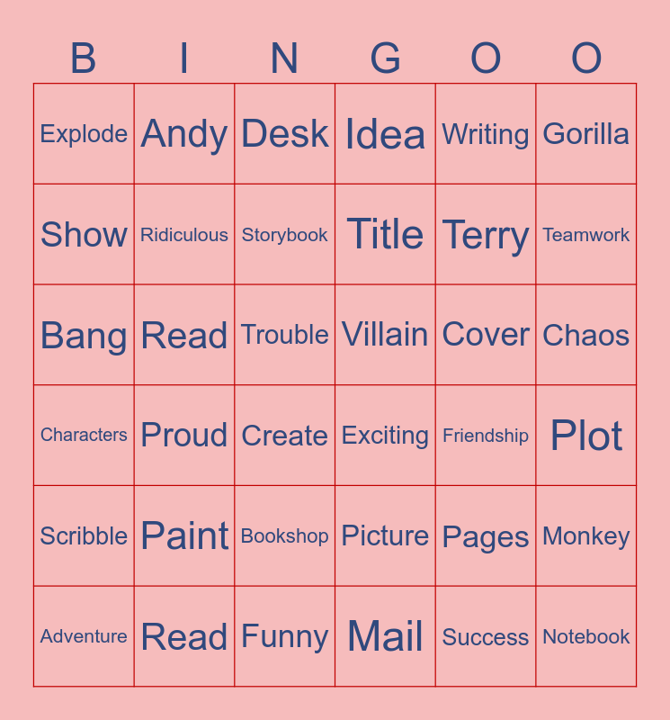 This bingo card has 104 words: Treehouse, Book, Writing, Typing, Story, Deadline, Publisher, Phone, Call, Ring, Page, Illustration, Drawing, Pen, Pencil, Notebook, Desk, Computer, Screen, Words, Sentence, Paragraph, Editing, Typing, Printing, Cover, Title, Idea, Imagination, Brainstorm, Characters, Plot, Problem, Solution, Adventure, Funny, Crazy, Silly, Ridiculous, Exciting, Hero, Villain, Monkey, Gorilla, Banana, Explode, Crash, Bang, Splash, Scribble, Colour, Paint, Picture, Comic, Cartoon, Laugh, Giggle, Joke, Mess, Chaos, Trouble, Help, Fix, Finish, Publish, Read, Author, Andy, Terry, Teamwork, Friendship, Working, Together, Talk, Explain, Listen, Think, Create, Design, Build, Write, Draw, Show, Tell, Read, Celebrate, Bookshop, Printer, Delivery, Mail, Package, Surprise, Happy, Proud, Success, Excitement, Fun, Storybook, Pages, End, Beginning, Middle, Finished and The End.