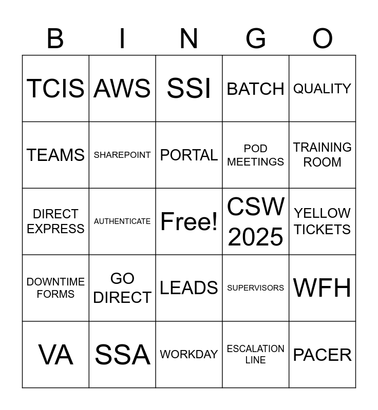 This bingo card has a free space and 24 words: GO DIRECT, SSA, PORTAL, VA, QUALITY, TCIS, TEAMS, AWS, CSW 2025, LEADS, POD MEETINGS, DIRECT EXPRESS, SUPERVISORS, WFH, SHAREPOINT, ESCALATION LINE, YELLOW TICKETS, SSI, TRAINING ROOM, AUTHENTICATE, PACER, DOWNTIME FORMS, BATCH and WORKDAY.