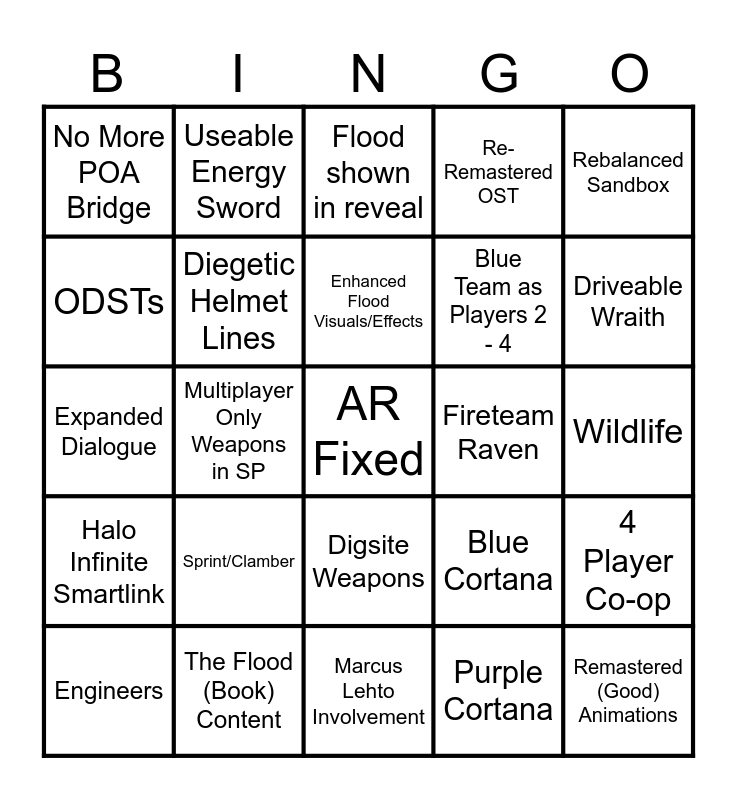 This bingo card has a free space and 24 words: Sprint/Clamber, The Flood (Book) Content, Enhanced Flood Visuals/Effects, Engineers, Rebalanced Sandbox, No More POA Bridge, ODSTs, Useable Energy Sword, Fireteam Raven, Digsite Weapons, Blue Team as Players 2 - 4, Expanded Dialogue, Blue Cortana, 4 Player Co-op, Diegetic Helmet Lines, Purple Cortana, Wildlife, Flood shown in reveal, Driveable Wraith, Multiplayer Only Weapons in SP, Remastered (Good) Animations, Halo Infinite Smartlink, Re-Remastered OST and Marcus Lehto Involvement.