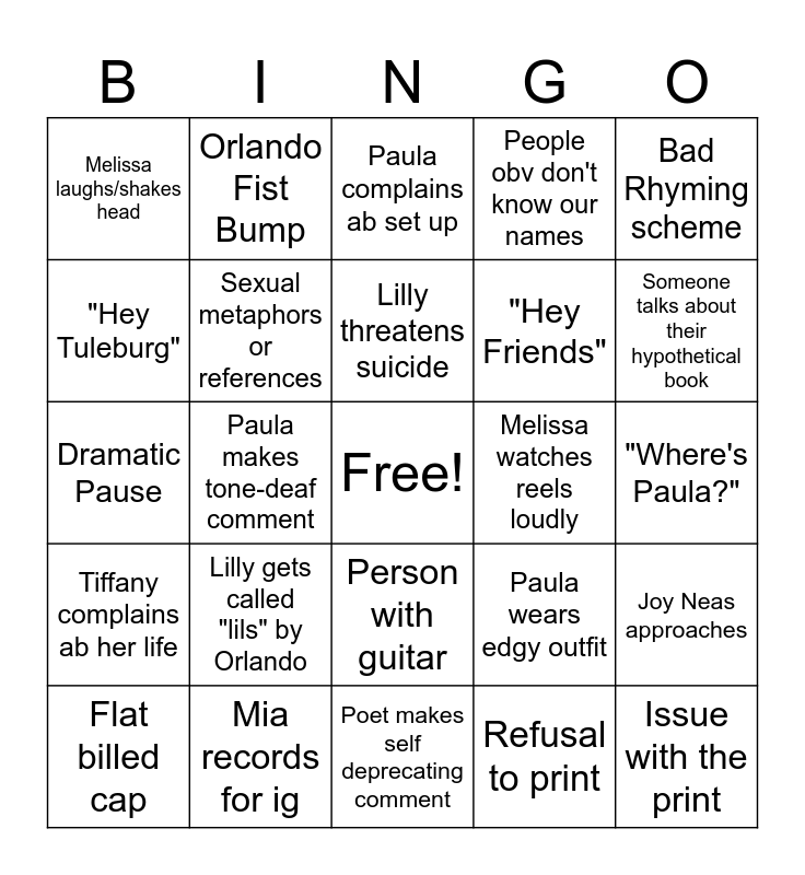 This bingo card has a free space and 24 words: Lilly gets called "lils" by Orlando, Mia records for ig, Lilly threatens suicide, Flat billed cap, Bad Rhyming scheme, Melissa laughs/shakes head, "Hey Tuleburg", Orlando Fist Bump, Melissa watches reels loudly, Person with guitar, "Hey Friends", Dramatic Pause, Paula wears edgy outfit, Joy Neas approaches, Sexual metaphors or references, Refusal to print, "Where's Paula?", Paula complains ab set up, Someone talks about their hypothetical book, Paula makes tone-deaf comment, Issue with the print, Tiffany complains ab her life, People obv don't know our names and Poet makes self deprecating comment.