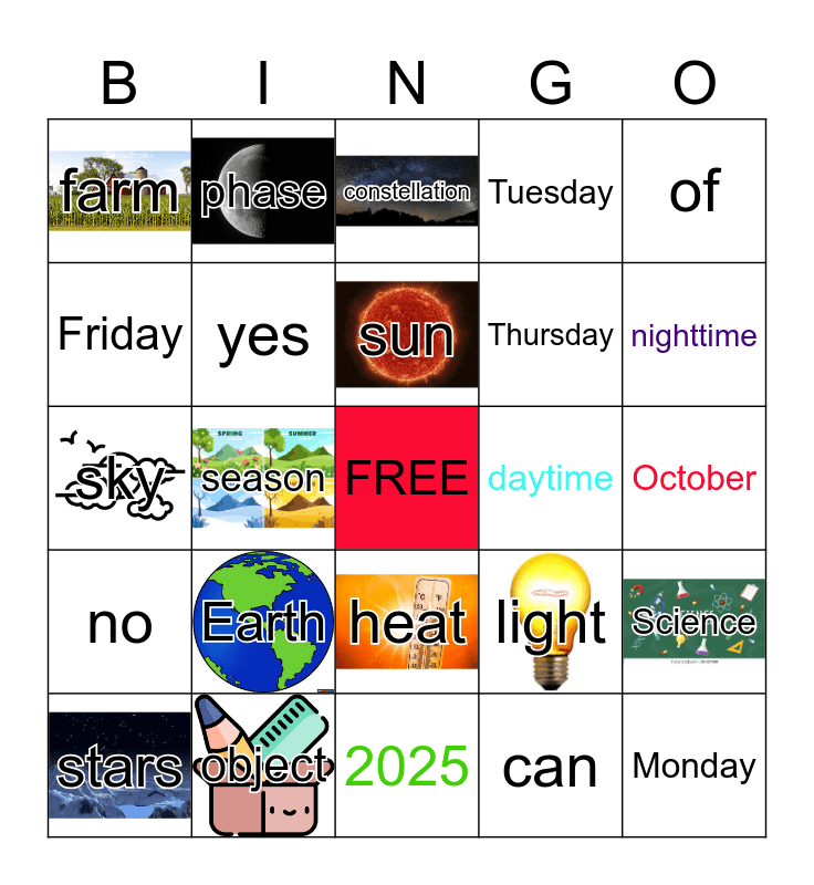This bingo card has 18 images, a free space and 34 words: I, can, see, clock, no, yes, of, stars, phase, moon, sun, constellation, shadow, Inca, daytime, nighttime, object, sky, Earth, light, heat, pattern, farm, October, 2025, Monday, Tuesday, Wednesday, Thursday, Friday, Saturday, season, Science and weather.