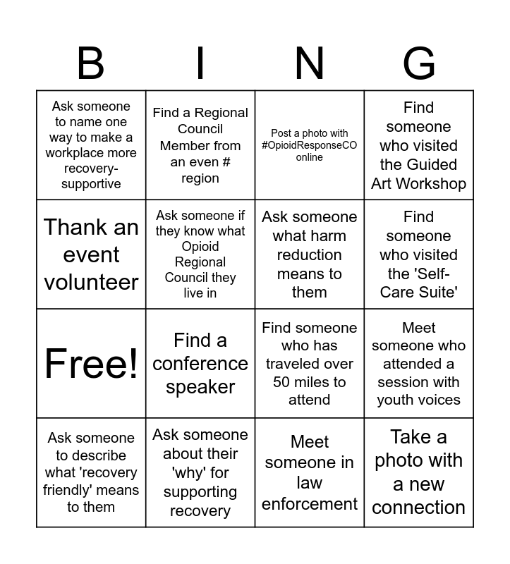 This bingo card has 20 words: Meet someone who attended a session with youth voices, Try a handcrafted mocktail, Post a photo with #OpioidResponseCO online, Find a Regional Council Member from an odd # region, Ask someone to describe what 'recovery friendly' means to them, Thank an event volunteer, Ask someone about their 'why' for supporting recovery, Ask someone to name one way to make a workplace more recovery-supportive, Free!, Find a Regional Council Member from an even # region, Find a conference speaker, Find someone who has traveled over 50 miles to attend, Ask someone if they know what Opioid Regional Council they live in, Take a photo with a new connection, Ask someone what harm reduction means to them, Read 1 'Stories in Black and White' story, Find someone who visited the 'Self-Care Suite', Find someone who visited the Guided Art Workshop, Meet someone in law enforcement and Share a takeaway from a session.