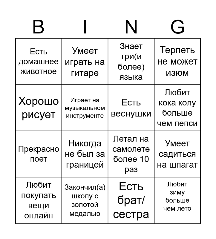 This bingo card has 16 words: Закончил(а) школу с золотой медалью, Умеет садиться на шпагат, Знает три(и более) языка, Есть домашнее животное, Прекрасно поет, Умеет играть на гитаре, Летал на самолете более 10 раз, Есть брат/сестра, Хорошо рисует, Играет на музыкальном инструменте, Любит покупать вещи онлайн, Терпеть не может изюм, Никогда не был за границей, Любит кока колу больше чем пепси, Есть веснушки and Любит зиму больше чем лето.