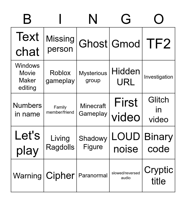 This bingo card has a free space and 24 words: Living Ragdolls, Cipher, Mysterious group, Warning, TF2, Text chat, Windows Movie Maker editing, Missing person, First video, Shadowy Figure, Hidden URL, Numbers in name, LOUD noise, Binary code, Roblox gameplay, slowed/reversed audio, Glitch in video, Ghost, Investigation, Family member/friend, Cryptic title, Let's play, Gmod and Paranormal.