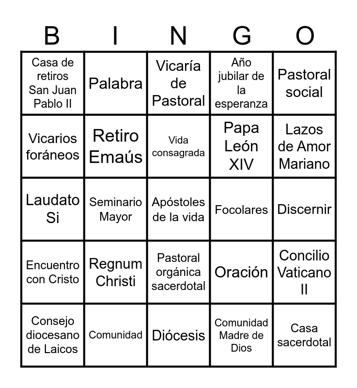 This bingo card has 111 words: Free!, Evangelizar, Pastoral, Conversión, Discipulado, Misión, Pastoral de misiones, Pastoral de matrimonio, vida y familia, 40 días por la vida, Pastoral de Infancia y adolescencia, Pastoral juvenil, Pastoral vocacional, Comisión de perdón, reconciliación y paz, Pastoral del deporte y la cultura, Animación bíblica de la pastoral, Centro de comunicaciones San francisco de Sales, Pastoral orgánica sacerdotal, Pastoral de la esperanza, Pastoral educativa, Pastoral universitaria, Consejo diocesano de Laicos, Vicaría de Pastoral, Comunidades religiosas, Visiteo Permanente, Misionero, Encuentro con Cristo, Comunidad, Comunión, Instituto de Teología y Pastoral Benedicto XVI, Casa de ejercicios san Pablo, Casa de retiros San Juan Pablo II, Seminario Mayor, Casa sacerdotal, Curia diocesana, Pastoral administrativa, Oficina jurídica, Oficina de Talento humano, Cooperativa de fraternidad sacerdotal, Fondo diocesano de solidaridad sacerdotal, Parque cementerio Jardines de Armenia, Nuevo Nazareth, Casa sacerdotal Portal de María, Finca Palo verde, Orden Franciscana Seglar, Vida consagrada, Parroquia, Diócesis, Conferencia Episcopal, Vicarías, Sectorización, Pastoral del adulto mayor, Cultura del cuidado y protección de menores, Tribunal eclesiástico, Cancillería diocesana, Vicaría general, Obispo diocesano, Vicarios foráneos, Colegio de consultores, Consejo presbiteral, Consejo de pastoral, Consejo de asuntos económicos, Librería y almacén litúrgico, Pastoral de catequesis, Comunidades de parejas, Equipos de Nuestra Señora, Papa León XIV, Santuarios diocesanos, Jefes de sector, Movimientos de espiritualidad, Retiro Emaús, Lazos de Amor Mariano, Schoenstatt, Encuentro matrimonial, Encentro de novios, Encuentro Juvenil, Heraldos del Evangelio, Comunión y Liberación, Via Pacis, Renovación Carismática, Regnum Christi, Oratorio Mariano, Comunidad Madre de Dios, Focolares, Concilio Vaticano II, Magisterio de la Iglesia, María Inmaculada, Año jubilar de la esperanza, Artesanos de la paz, Apóstoles de la vida, Banco de alimentos, Pastoral social, Anawim, Pastoral de migrantes, Personas en situación de calle, Pastoral rural y de la tierra, Fratelli Tutti, Laudato Si, Tejiendo Sueños de Esperanza, Hogar la Esperanza, Servida la Vida es sagrada, Museo de arte religioso, Hogar Niño Jesús de Praga, Edificación espiritual, Solidaridad social, Oración, Palabra, Cruz, Sinodalidad, Escuchar, Discernir and Decidir.