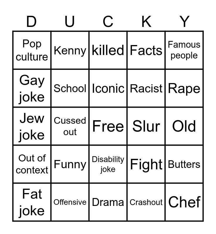 This bingo card has a free space and 24 words: Funny, Offensive, Iconic, Fat joke, Famous people, Pop culture, Gay joke, Kenny, Slur, Disability joke, Racist, Jew joke, Fight, Butters, School, Crashout, Old, killed, Rape, Cussed out, Chef, Out of context, Facts and Drama.