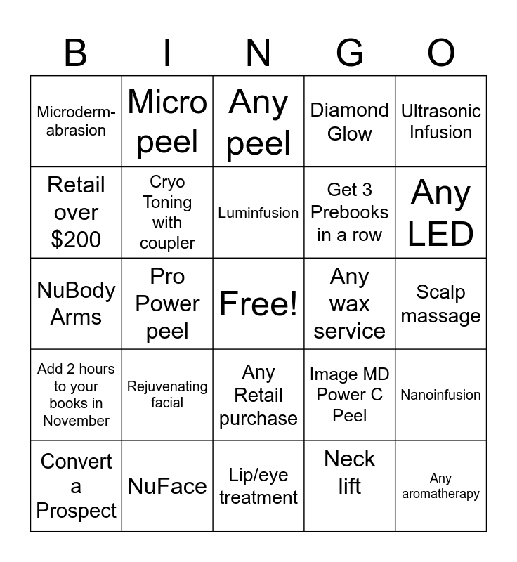 This bingo card has a free space and 29 words: Convert a Prospect, Any Image Exceptional, Pro Power peel, Pro firm neck, Microderm- abrasion, Any peel, Cryo Toning with coupler, Rejuvenating facial, Any wax service, NuFace, Scalp massage, Any aromatherapy, Lip/eye treatment, Neck lift, Any LED, NuFace Microcurrent Image, Any Retail purchase, Add 2 hours to your books in November, Ultrasonic Infusion, NuBody Arms, Image MD Power C Peel, Image Decollete Facial, Get 3 Prebooks in a row, Retail over $200, Diamond Glow, Micro peel, Nanoinfusion, Luminfusion and 2 Google reviews in one day.