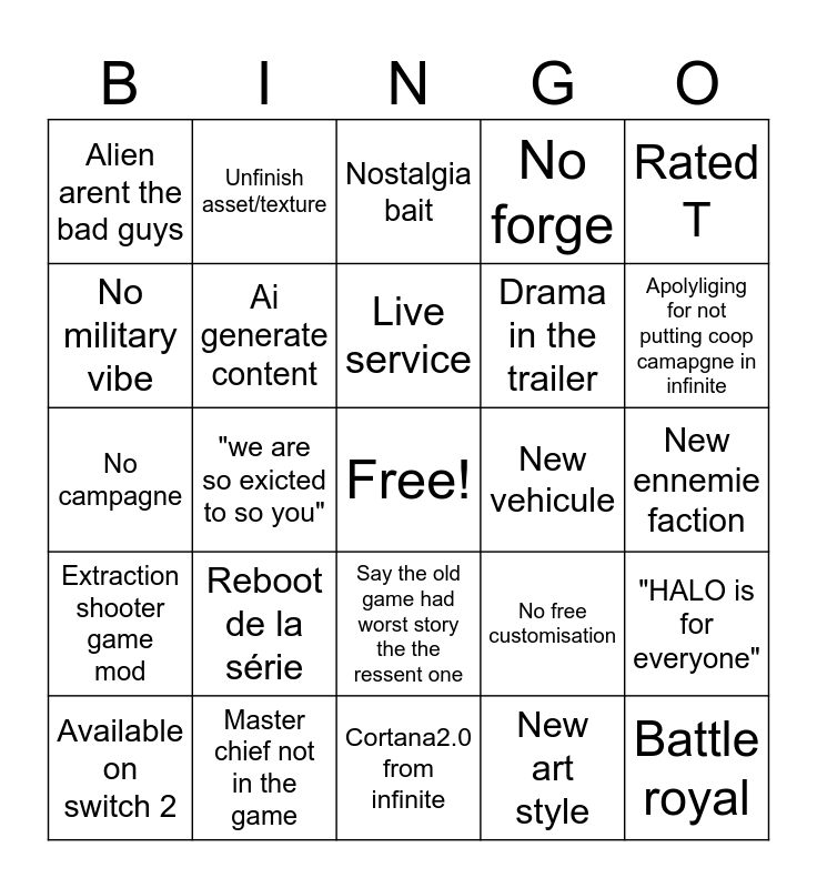 This bingo card has a free space and 24 words: Reboot de la série, Master chief not in the game, Live service, Available on switch 2, Rated T, Alien arent the bad guys, No military vibe, Unfinish asset/texture, New vehicule, Say the old game had worst story the the ressent one, Drama in the trailer, No campagne, No free customisation, "HALO is for everyone", Ai generate content, New art style, New ennemie faction, Nostalgia bait, Apolyliging for not putting coop camapgne in infinite, "we are so exicted to so you", Battle royal, Extraction shooter game mod, No forge and Cortana2.0 from infinite.