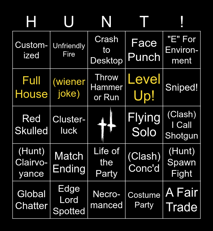 This bingo card has a free space and 44 words: 2 Days From Retiring, A Fair Trade, Bush Wookie, Global Chatter, Compound Turtles, Costume Party, Crash to Desktop, Dead Man's Click, "E" For Environ-ment, Edge Lord Spotted, Face Punch, Flying Solo, Life of the Party, Match Ending, Meta Loadout, Necro-manced, Quick and Efficient, Red Skulled, Scarce Trait, Sniped!, Unfriendly Fire, Mercy Killing, Kiteskin, Custom-ized, (Clash) Better Late..., (Clash) I Call Shotgun, (Clash) In This Economy?, (Clash) Razor's Edge, (Clash) Conc'd, (Hunt) Clairvo-yance, (Hunt) Hiking Simulator, (Hunt) Spawn Fight, (Hunt) That Was Fast, (Hunt) VII - The Chariot, Cluster-luck, Last Resort, Stefano, Rainbow Six, Throw Hammer or Run, Full House, Level Up!, Random Bullshit Go!, (wiener joke) and Collect-athon.