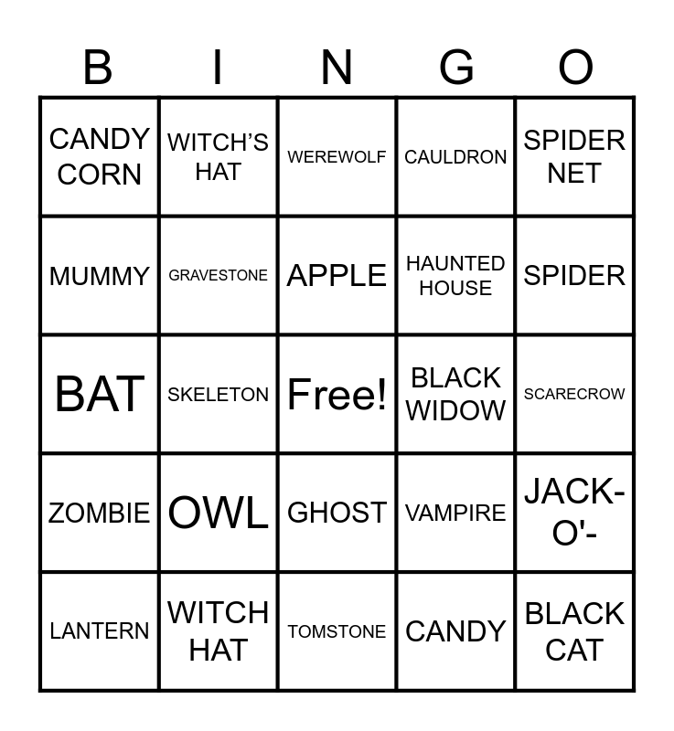This bingo card has a free space and 26 words: GHOST, CANDY, APPLE, WITCH HAT, SPIDER NET, CANDY CORN, MUMMY, WITCH’S HAT, SCARECROW, VAMPIRE, HAUNTED HOUSE, BAT, JACK-O'-, LANTERN, SKELETON, SKELETON HAND, CAULDRON, ZOMBIE, WEREWOLF, BLACK CAT, SPIDER, TOMSTONE, BLACK WIDOW, OWL, GRAVESTONE and Autumn.