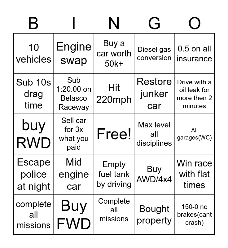 This bingo card has a free space and 24 words: Mid engine car, Buy FWD, Hit 220mph, complete all missions, 0.5 on all insurance, 10 vehicles, Sub 10s drag time, Engine swap, Max level all disciplines, Empty fuel tank by driving, Restore junker car, buy RWD, Buy AWD/4x4, Win race with flat times, Sub 1:20.00 on Belasco Raceway, Bought property, All garages(WC), Buy a car worth 50k+, Drive with a oil leak for more then 2 minutes, Sell car for 3x what you paid, 150-0 no brakes(cant crash), Escape police at night, Diesel gas conversion and Complete all missions.