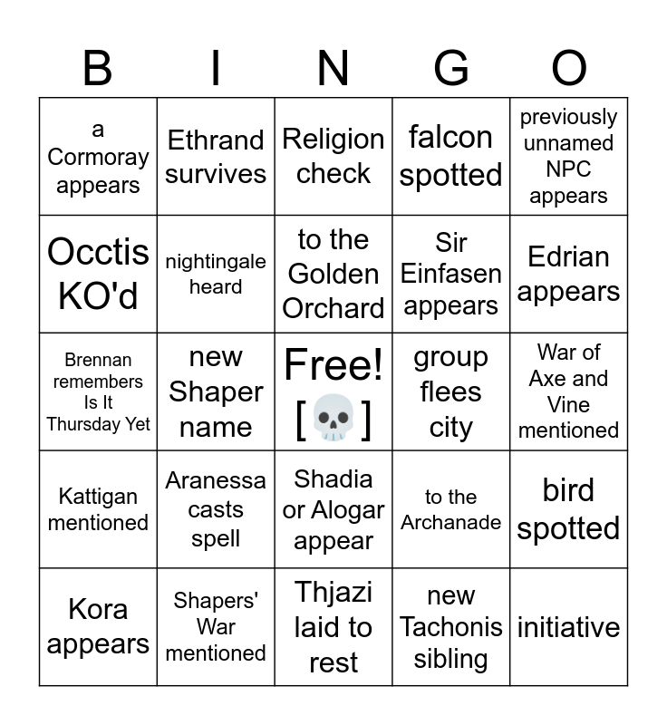 This bingo card has a free space and 46 words: new psychopomp lore, initiative, multiple initiatives, Thjazi laid to rest, Aranessa casts spell, Aranessa survives, Ethrand survives, Pin survives, Occtis KO'd, new subclass discernible, nightingale heard, falcon spotted, bird spotted, to the Archanade, to the Penteveral, to Hal's house, to the Golden Orchard, group flees city, group flees realm, previously unnamed NPC appears, new Shaper name, new Tachonis sibling, a Cormoray appears, Sir Einfasen appears, Jahar, Ilondria, or Mardonus appear, Edrian appears, Kora appears, Primus appears, Shadia or Alogar appear, Kattigan mentioned, Teor mentioned, Thimble mentioned, Tyranny mentioned, Wick mentioned, Falconer's Rebellion mentioned, Shapers' War mentioned, War of Axe and Vine mentioned, Arcana check, Charisma skill check, Insight check against NPC, Insight check against PC, Religion check, Brennan remembers Is It Thursday Yet, Brennan forgets Is It Thursday Yet, new info on Julien's curse and PCs hit Level 4.