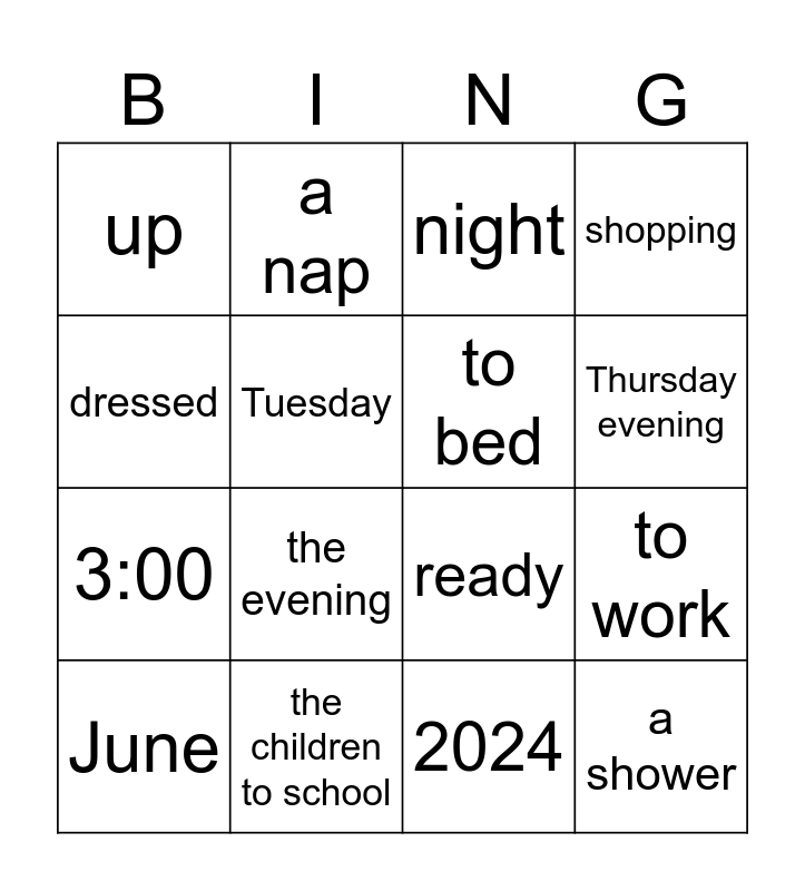 This bingo card has 16 words: the children to school, to work, night, up, 3:00, a nap, ready, 2024, dressed, Tuesday, June, shopping, the evening, Thursday evening, to bed and a shower.