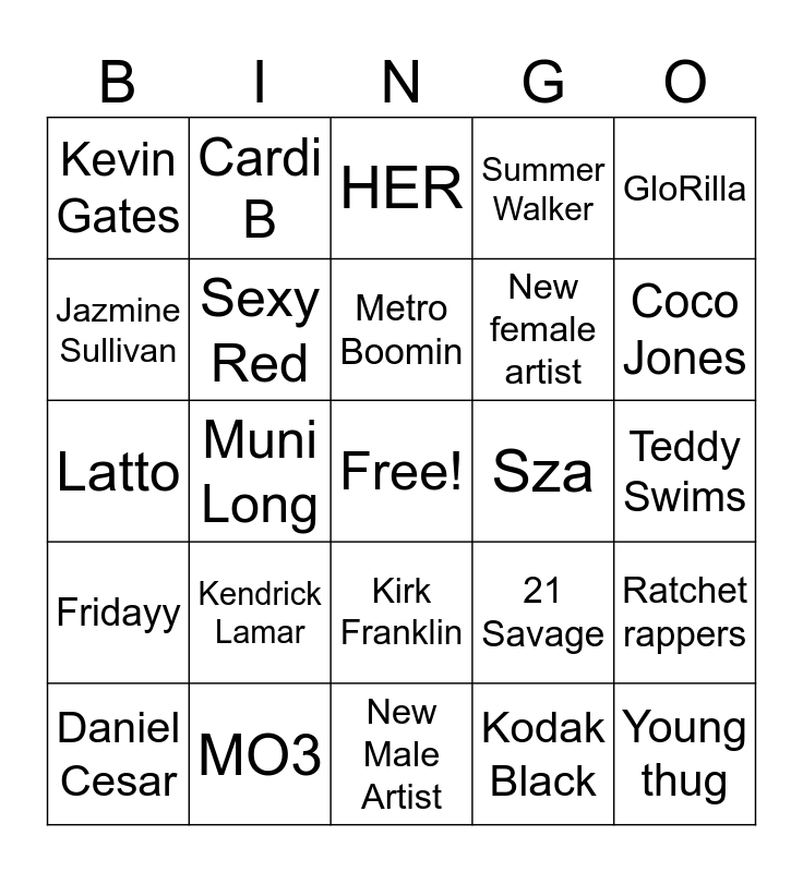 This bingo card has a free space and 24 words: Kendrick Lamar, MO3, Metro Boomin, Daniel Cesar, GloRilla, Kevin Gates, Jazmine Sullivan, Cardi B, Sza, Kirk Franklin, New female artist, Latto, 21 Savage, Ratchet rappers, Sexy Red, Kodak Black, Teddy Swims, HER, Coco Jones, Muni Long, Young thug, Fridayy, Summer Walker and New Male Artist.