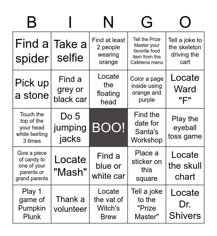 This bingo card has a free space and 24 words: Locate "Mash", Thank a volunteer, Locate the floating head, Play 1 game of Pumpkin Plunk, Tell a joke to the skeleton driving the cart, Find a spider, Pick up a stone, Take a selfie, Find the date for Santa's Workshop, Find a blue or white car, Color a page inside using orange and purple, Touch the top of the your head while twirling 3 times, Place a sticker on this square, Locate the skull chart, Find a grey or black car, Tell a joke to the "Prize Master", Play the eyeball toss game, Find at least 2 people wearing orange, Locate Ward "F", Do 5 jumping jacks, Locate Dr. Shivers, Give a piece of candy to one of your parents or grand parents, Tell the Prize Master your favorite food item from the Cafeteria menu and Locate the vat of Witch's Brew.