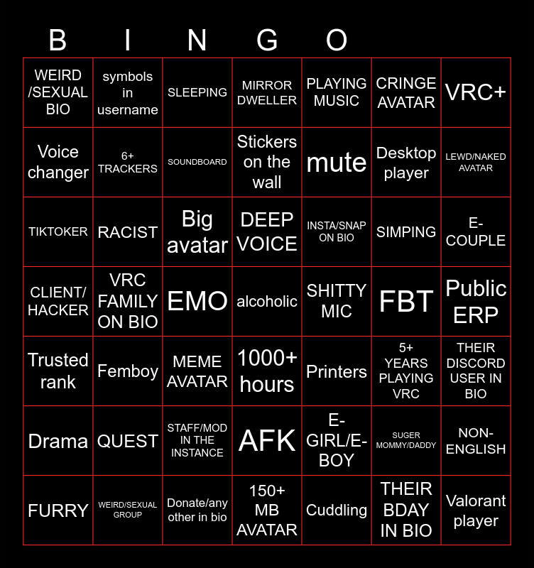 This bingo card has a free space and 48 words: Trusted rank, VRC FAMILY ON BIO, Donate/any other in bio, 1000+ hours, mute, FBT, VRC+, FURRY, RACIST, EMO, MIRROR DWELLER, PLAYING MUSIC, SIMPING, E-COUPLE, CLIENT/ HACKER, QUEST, SLEEPING, DEEP VOICE, E-GIRL/E-BOY, CRINGE AVATAR, LEWD/NAKED AVATAR, Voice changer, symbols in username, SOUNDBOARD, Cuddling, Desktop player, Public ERP, Drama, Femboy, Big avatar, AFK, INSTA/SNAP ON BIO, SUGER MOMMY/DADDY, NON-ENGLISH, WEIRD /SEXUAL BIO, WEIRD/SEXUAL GROUP, MEME AVATAR, 150+ MB AVATAR, SHITTY MIC, THEIR BDAY IN BIO, THEIR DISCORD USER IN BIO, TIKTOKER, 6+ TRACKERS, STAFF/MOD IN THE INSTANCE, Stickers on the wall, Printers, 5+ YEARS PLAYING VRC and Valorant player.