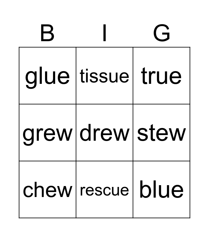 This bingo card has 15 words: few, new, true, glue, rescue, drew, barbecue, statue, stew, blue, blew, grew, chew, tissue and screw.