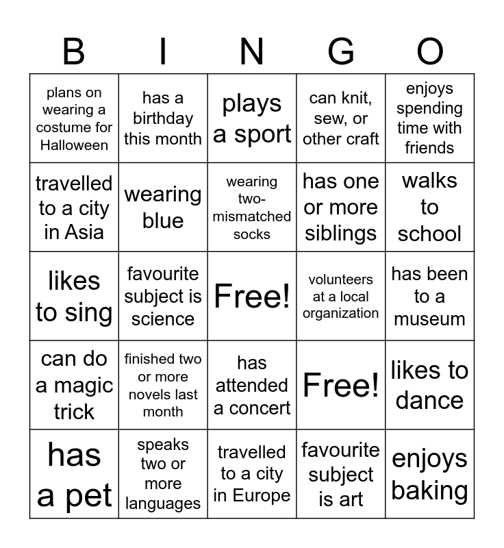 This bingo card has a free space and 27 words: Free!, Free!, has one or more siblings, travelled to a city in Europe, travelled to a city in Asia, plays a sport, has a birthday this month, can do a magic trick, volunteers at a local organization, likes to dance, likes to sing, can knit, sew, or other craft, has a pet, speaks two or more languages, walks to school, has been on a rollercoaster, wearing blue, wearing two-mismatched socks, finished two or more novels last month, plans on wearing a costume for Halloween, has been to a museum, favourite subject is art, favourite subject is science, enjoys baking, has attended a concert, enjoys spending time with friends and watches too much TV.