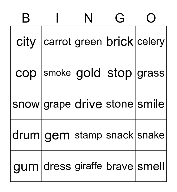 This bingo card has 25 words: gem, giraffe, gold, gum, celery, city, cop, carrot, stone, stamp, stop, snow, snack, snake, smoke, smell, smile, green, grass, grape, drive, dress, drum, brick and brave.