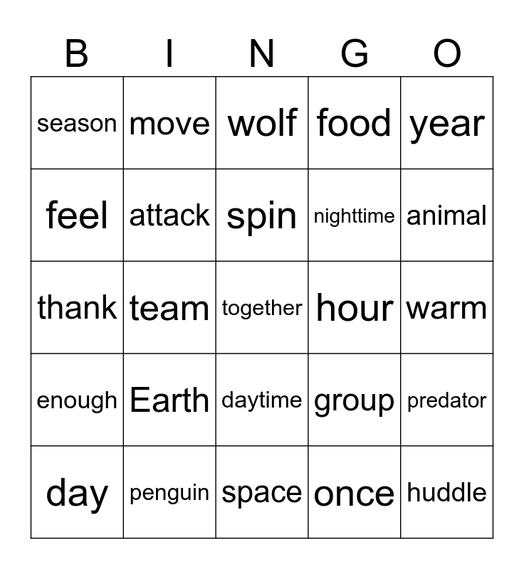 This bingo card has 25 words: Earth, space, spin, day, year, season, feel, move, hour, daytime, nighttime, thank, group, predator, attack, huddle, warm, wolf, animal, team, together, penguin, enough, food and once.