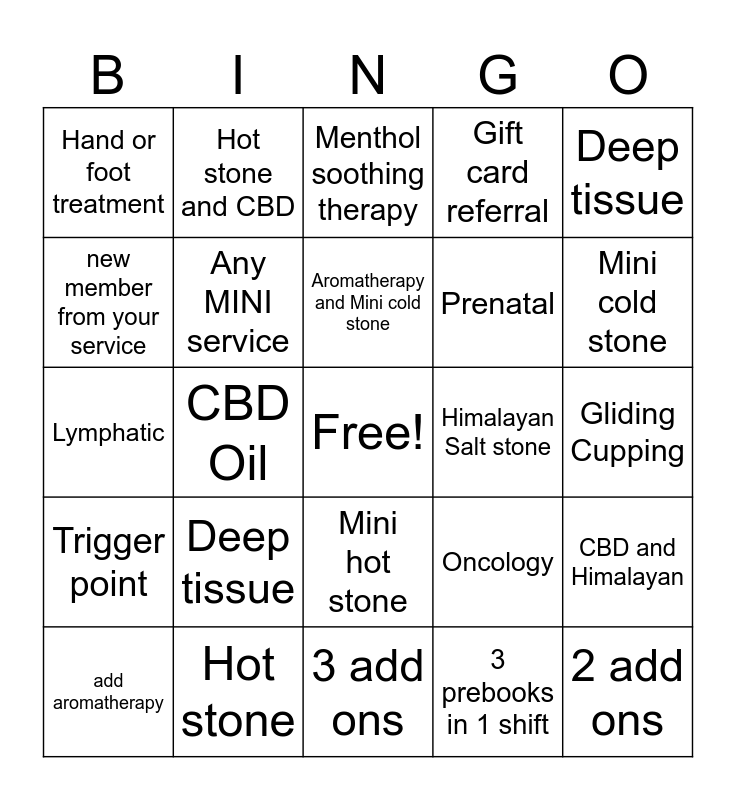 This bingo card has a free space and 29 words: add aromatherapy, scalp massage, CBD Oil, Contrast therapy, Hand or foot treatment, Menthol soothing therapy, Any MINI service, Deep tissue, Himalayan Salt stone, Hot stone, Gliding Cupping, 2 add ons, 3 add ons, 3 prebooks in 1 shift, Mini cold stone, Mini cupping, Mini hot stone, Trigger point, Deep tissue, Lymphatic, Oncology, Shiatsu, Prenatal, new member from your service, Gift card referral, Hot stone and CBD, CBD and Himalayan, Aromatherapy and Mini cold stone and Trigger point, gliding cup and Aromatherapy.