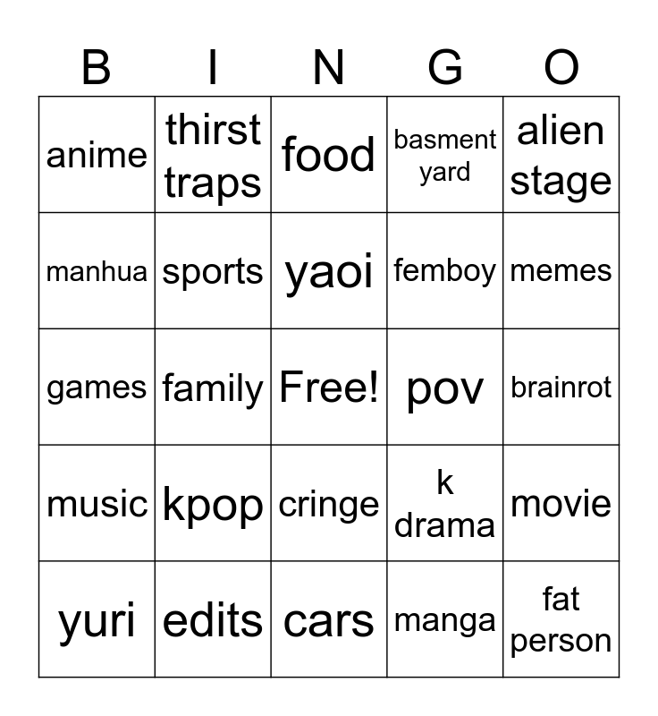 This bingo card has a free space and 24 words: kpop, edits, yaoi, yuri, alien stage, anime, manhua, thirst traps, pov, cringe, femboy, games, k drama, movie, sports, manga, brainrot, food, memes, family, fat person, music, basment yard and cars.