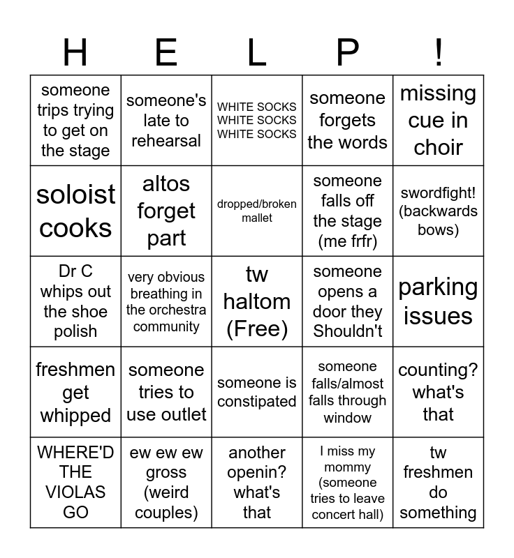 This bingo card has a free space and 49 words: Broken string, tw freshmen do something, Dr C crashout, another openin? what's that, someone tries to use outlet, hairspray overload, someone's late to rehearsal, failed page turn, soloist cooks, missed rim shot, altos forget part, someone forgets the words, counting? what's that, someone falls/almost falls through window, THIS VENUE'S SCARY WE'RE ALL GONNA DIE, Marissa almost falls from balcony (rip), dropped/broken mallet, someone opens a door they Shouldn't, symphony strings' obvious disdain for Harlem, missing cue in choir, very obvious breathing in the orchestra community, I miss my mommy (someone tries to leave concert hall), someone trips trying to get on the stage, someone falls off the stage (me frfr), instrument squeak, swordfight! (backwards bows), WHERE'D THE VIOLAS GO, all school rehearsal goes on too long, someone is constipated, freshmen get whipped, percussionists die from exhaustion, health emergency, someone forgets instrument, choir voice crack, ew ew ew gross (weird couples), third wall break, wardrobe malfunction, Dr C tells someone not to preform, parking issues, somebody can't find warnors, blisters everywhere, sea of instrument cases, wrong instrument in wrong area, someone doesn't follow dresscode, Dr C whips out the shoe polish, WHITE SOCKS WHITE SOCKS WHITE SOCKS, Dr C lectures freshman, kids get lectured while show's going on and full house!.