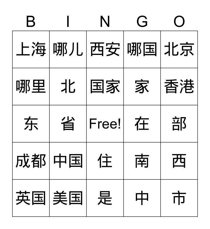 This bingo card has a free space and 24 words: 中国, 美国, 国家, 英国, 北京, 上海, 哪里, 哪儿, 在, 住, 家, 东, 南, 西, 北, 中, 部, 西安, 香港, 省, 市, 成都, 哪国 and 是.