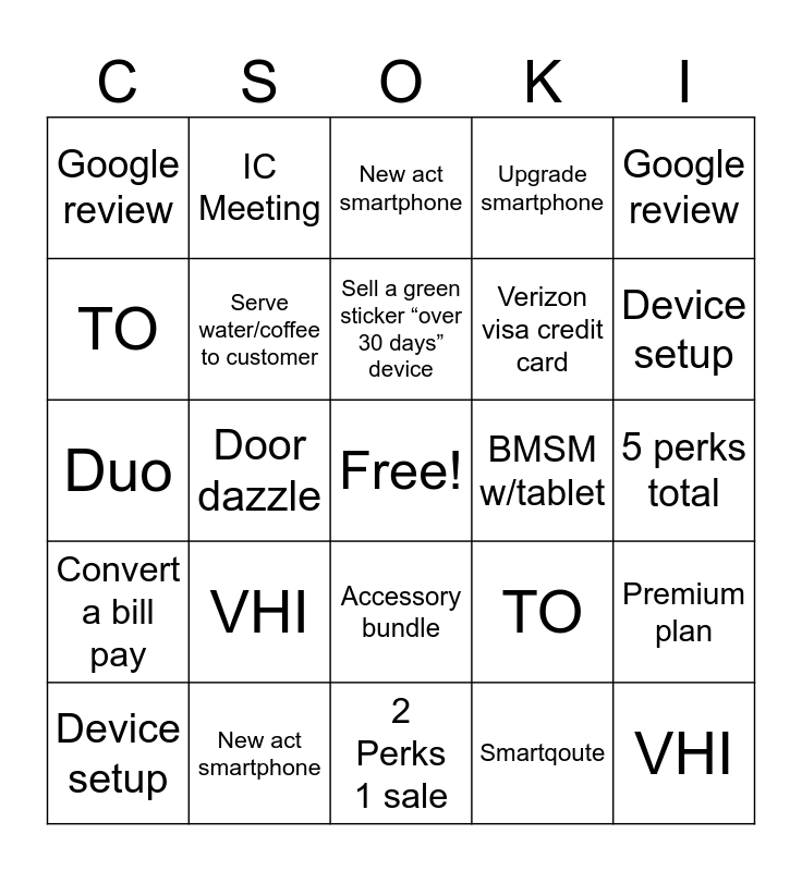 This bingo card has a free space and 24 words: Device setup, VHI, Sell a green sticker “over 30 days” device, Smartqoute, Google review, Google review, IC Meeting, New act smartphone, BMSM w/tablet, 5 perks total, Duo, Serve water/coffee to customer, TO, Premium plan, TO, New act smartphone, 2 Perks 1 sale, Upgrade smartphone, Device setup, Convert a bill pay, Door dazzle, Accessory bundle, Verizon visa credit card and VHI.