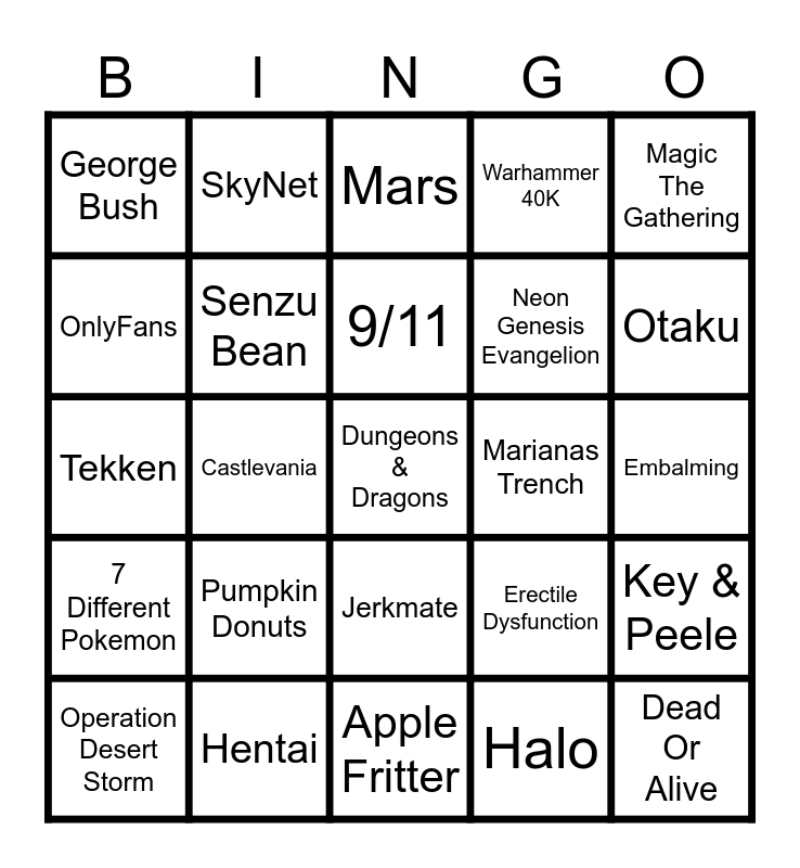 This bingo card has 25 words: Pumpkin Donuts, Apple Fritter, 9/11, Operation Desert Storm, Magic The Gathering, George Bush, OnlyFans, SkyNet, Marianas Trench, Jerkmate, Neon Genesis Evangelion, Tekken, Erectile Dysfunction, Key & Peele, Senzu Bean, Dead Or Alive, Embalming, Mars, Otaku, Castlevania, Dungeons & Dragons, Hentai, 7 Different Pokemon, Warhammer 40K and Halo.