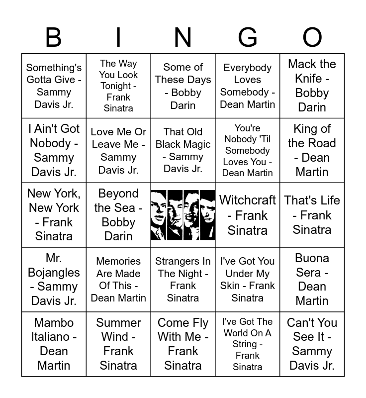 This bingo card has a free space and 34 words: Ain't That A Kick In The Head - Dean Martin, Fly Me To The Moon - Frank Sinatra, That's Amore - Dean Martin, My Way - Frank Sinatra, That's Life - Frank Sinatra, Something's Gotta Give - Sammy Davis Jr., Love Me Or Leave Me - Sammy Davis Jr., Come Fly With Me - Frank Sinatra, You're Nobody 'Til Somebody Loves You - Dean Martin, Can't You See It - Sammy Davis Jr., I Ain't Got Nobody - Sammy Davis Jr., The Way You Look Tonight - Frank Sinatra, I've Got The World On A String - Frank Sinatra, Just In Time - Dean Martin, New York, New York - Frank Sinatra, Memories Are Made Of This - Dean Martin, Strangers In The Night - Frank Sinatra, I've Got You Under My Skin - Frank Sinatra, Buona Sera - Dean Martin, Mr. Bojangles - Sammy Davis Jr., Summer Wind - Frank Sinatra, The Candy Man - Sammy Davis Jr., Everybody Loves Somebody - Dean Martin, King of the Road - Dean Martin, Mambo Italiano - Dean Martin, That Old Black Magic - Sammy Davis Jr., Witchcraft - Frank Sinatra, The Girl From Ipanema - Frank Sinatra, Beyond the Sea - Bobby Darin, Some of These Days - Bobby Darin, Call Me Irresponsible - Bobby Darin, Mack the Knife - Bobby Darin, When lights are low- Vic Damone and All I do is dream of you- Dean Martin.