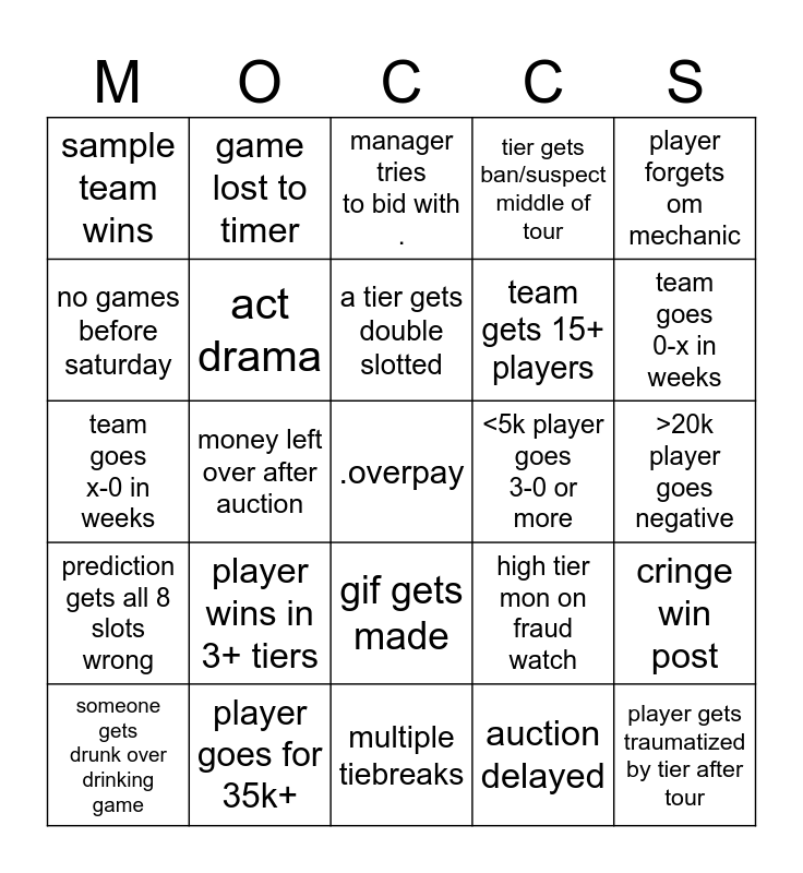 This bingo card has a free space and 24 words: player wins in 3+ tiers, player goes for 35k+, a tier gets double slotted, someone gets drunk over drinking game, player forgets om mechanic, sample team wins, no games before saturday, game lost to timer, <5k player goes 3-0 or more, gif gets made, team gets 15+ players, team goes x-0 in weeks, high tier mon on fraud watch, cringe win post, act drama, auction delayed, >20k player goes negative, manager tries to bid with ., team goes 0-x in weeks, money left over after auction, player gets traumatized by tier after tour, prediction gets all 8 slots wrong, tier gets ban/suspect middle of tour and multiple tiebreaks.