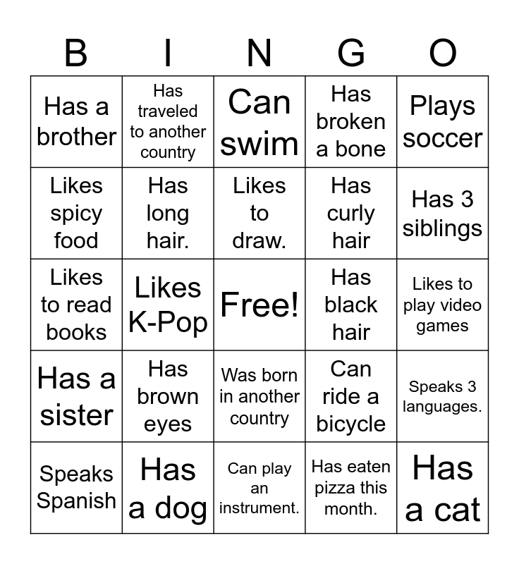 This bingo card has a free space and 24 words: Has brown eyes, Has a dog, Likes to draw., Speaks Spanish, Plays soccer, Has a brother, Likes spicy food, Has traveled to another country, Has black hair, Was born in another country, Has curly hair, Likes to read books, Can ride a bicycle, Speaks 3 languages., Has long hair., Has eaten pizza this month., Likes to play video games, Can swim, Has 3 siblings, Likes K-Pop, Has a cat, Has a sister, Has broken a bone and Can play an instrument..