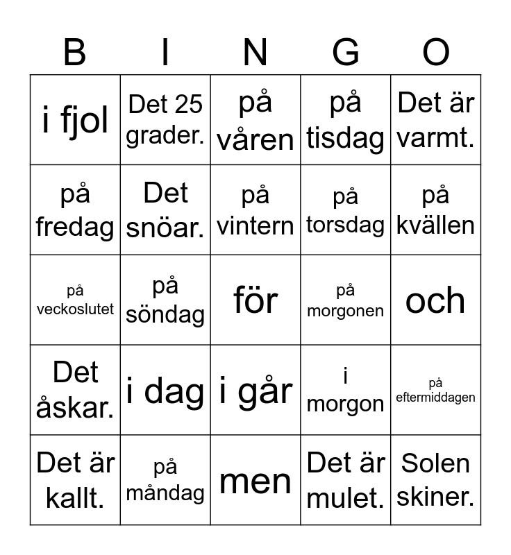 This bingo card has 34 words: Solen skiner., Det är mulet., Det regnar., Det blåser., Det åskar., Det snöar., Det är varmt., Det är kallt., Det 25 grader., Det är 5 minusgrader., på vintern, på våren, på sommaren, på hösten, på morgonen, på kvällen, på måndag, på veckoslutet, i dag, i morgon, i går, i år, i fjol, och, men, för, på tisdag, på onsdag, på torsdag, på fredag, på lördag, på söndag, på eftermiddagen and på förmiddagen.