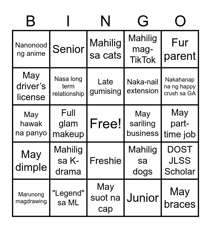 This bingo card has a free space and 38 words: Mahilig sa kape, May tattoo, Marunong magluto (hindi lang instant), Nasa long term relationship, DOST JLSS Scholar, Mahilig sa K-drama, Late gumising, DOST Undergraduate Scholar, Fur parent, Naka-nail extension, Full glam makeup, Mahilig mag-TikTok, May braces, May part-time job, May driver’s license, May dimple, Naka-glasses, Mahilig sa cats, May more than 3 siblings, May sariling business, Nanonood ng anime, "Legend" sa ML, Nakahanap na ng happy crush sa GA, Marunong magdrawing, Late dumating sa GA, May suot na cap, Naka-ponytail, May suot na ID, Shopee Gold Member, Knows more than 3 languages, May kapatid na lalaki, Freshie, Junior, Senior, Sophomore, Mahilig sa dogs, May hawak na panyo and Left-handed.