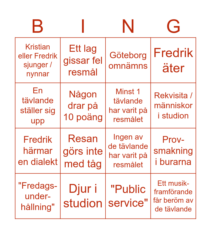 This bingo card has 16 words: Djur i studion, Prov-smakning i burarna, Göteborg omnämns, Kristian eller Fredrik sjunger / nynnar, Fredrik härmar en dialekt, Ett lag gissar fel resmål, Ingen av de tävlande har varit på resmålet, "Public service", En tävlande ställer sig upp, Någon drar på 10 poäng, "Fredags-under-hållning", Fredrik äter, Resan görs inte med tåg, Rekvisita / människor i studion, Minst 1 tävlande har varit på resmålet and Ett musik-framförande får beröm av de tävlande.