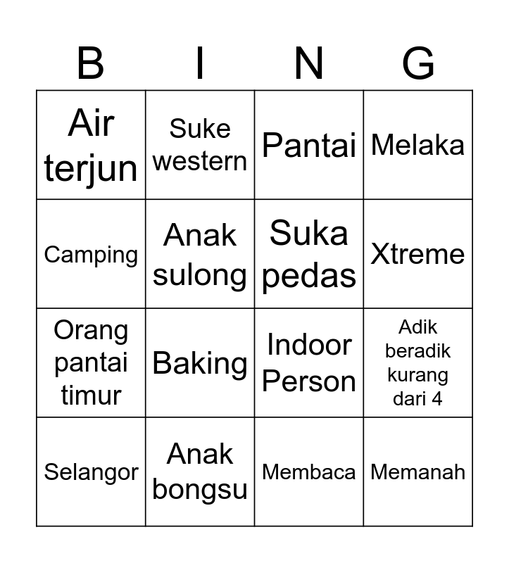 This bingo card has 16 words: Selangor, Anak bongsu, Pantai, Melaka, Camping, Suke western, Indoor Person, Adik beradik kurang dari 4, Air terjun, Anak sulong, Membaca, Xtreme, Orang pantai timur, Baking, Suka pedas and Memanah.