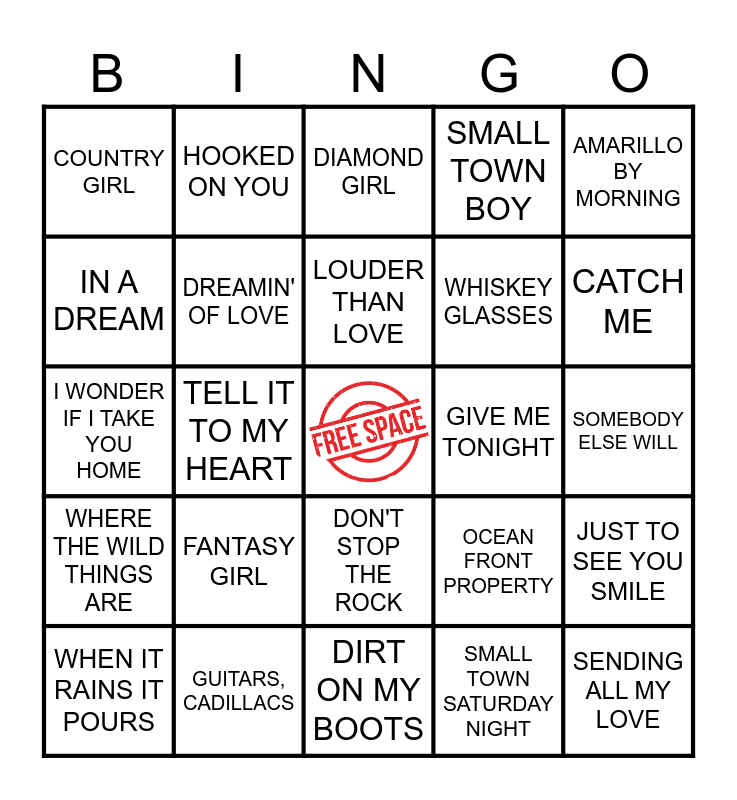 This bingo card has a free space and 85 words: WHEN I HEAR MUSIC, 9 TO 5, DIAMOND GIRL, THIS KISS, TENNESSEE WHISKEY, I'LL BE LOVING YOU, WHERE ARE YOU TONIGHT, WAGON WHEEL, YOUR MAN, BAD OF THE HEART, MARIA, CHICKEN FRIED, DREAMIN' OF LOVE, GIVE ME TONIGHT, FIRST TRUE LOVE, COUNTRY GIRL, WHEN IT RAINS IT POURS, IN A DREAM, SPRING LOVE, NEON MOON, POINT OF NO RETURN, WHISKEY GLASSES, SENDING ALL MY LOVE, HEAD OVER BOOTS, TELL IT TO MY HEART, BEAUTIFUL CRAZY, TWO OF HEARTS, YOU SHOULD PROBABLY LEAVE, LOOKOUT WEEKEND, AS GOOD AS I ONCE WAS, FANTASY GIRL, DRINKIN' PROBLEM, SILENT MORNING, I WONDER IF I TAKE YOU HOME, CRUISE, LET THE MUSIC PLAY, DIRT ON MY BOOTS, COME GO WITH ME, WHERE THE WILD THINGS ARE, CATCH ME, FASCINATED, CHATTAHOOCHEE, RUNNING, FOREVER AND EVER, AMEN, HEAD TO TOE, I WANNA BE THE ONE, JOLENE, FUNKY LITTLE BEAT, SHOW ME, PLAY IT AGAIN, HOOKED ON YOU, LOUDER THAN LOVE, BROKEN HALOS, THEY'RE PLAYING OUR SONG, I'LL BE ALL YOU EVER NEED, TAKE ME IN YOUR ARMS, GUITARS, CADILLACS, SMALL TOWN BOY, CAN YOU FEEL THE BEAT, POINT OF NO RETURN, I.O.U., DREAM BOY / DREAM GIRL, WHAT GOES AROUND COMES AROUND, COME INTO MY ARMS, BOOT SCOOTIN' BOOGIE, AMARILLO BY MORNING, WRITE THIS DOWN, JUST TO SEE YOU SMILE, I LOVE THIS BAR, CHANGE ON ME, MERCURY BLUES, LITTLE BITTY, THE FIREMAN, LOOKIN' FOR LOVE, CHEROKEE FIDDLE, DON'T STOP THE ROCK, SMALL TOWN SATURDAY NIGHT, TOGETHER FOREVER, DO I MAKE YOU WANNA, STRIP IT DOWN, SOMEBODY ELSE WILL, GETTIN' YOU HOME, IT MUST BE LOVE, OCEAN FRONT PROPERTY and THERE IS NO ARIZONA.