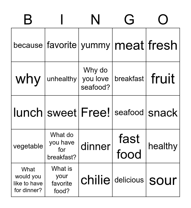 This bingo card has a free space and 24 words: What do you have for breakfast?, What is your favorite food?, Why do you love seafood?, What would you like to have for dinner?, fresh, because, why, favorite, seafood, dinner, breakfast, lunch, fast food, healthy, unhealthy, delicious, snack, yummy, fruit, sweet, sour, vegetable, meat and chilie.