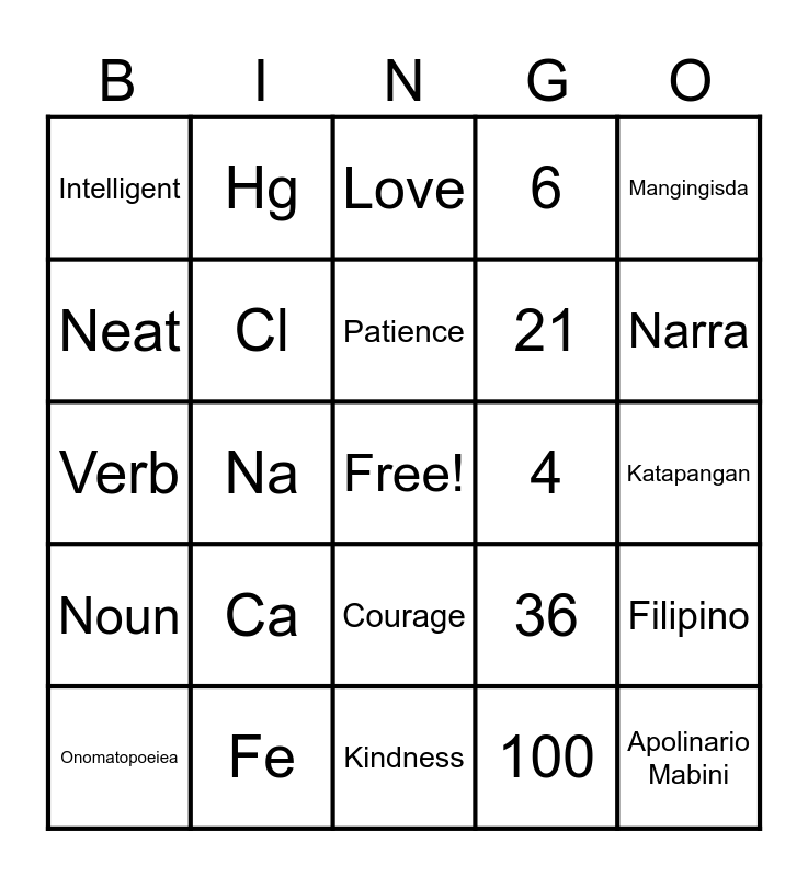 This bingo card has a free space and 74 words: Metaphor, Zn, Patience, 11, Agila, Hyperbole, Au, Forgiveness, 5, Lupang Hinirang, Onomatopoeiea, Ag, 21, Mangingisda, Glad, Fe, Loyalty, 4, Kapayapaan, Intelligent, Na, Love, 6, Katapangan, Neat, K, Cooperation, 99, Manuel L. Quezon, Imperative, Cl, Generousity, 250, Tandang Sora, Declarative, He, Peace, 3, Apolinario Mabini, Interrogate, H, Courage, 60, Balangay, Large, Hg, Responsibility, 99, Biag ni Lam-ang, Cool, Mg, Self-discipline, 36, Jose Rizal, Pronoun, Cu, Kindness, 7, Asya, Noun, Ca, Honesty, 100, Filipino, Verb, Pb, Integrity, 12, Narra, Adjective, W, Respect, 20 and Pamilya.