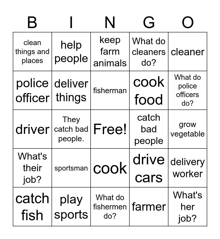 This bingo card has a free space and 24 words: sportsman, play sports, fisherman, catch fish, cleaner, clean things and places, police officer, help people, catch bad people, cook, cook food, driver, drive cars, delivery worker, deliver things, farmer, grow vegetable, keep farm animals, What do police officers do?, They catch bad people., What's her job?, What's their job?, What do cleaners do? and What do fishermen do?.