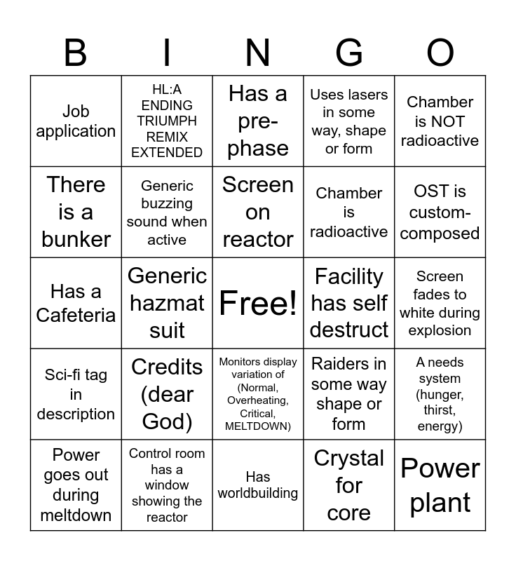 This bingo card has a free space and 74 words: Threatening Domain as prephase, Mjolnir Theme, Screen on reactor, Pressure Stall, Complicated shutdown procedure, Uses words "Light," "Nuclear," "Thermal.", Has a maintenance mode, People fighting over controls, Core is a ball, or crystal, Reactor can run out of fuel, Power goes out during meltdown, Fans are a cooling option, Chamber is radioactive, Chamber is NOT radioactive, Touching the core kills you, Control room has a window showing the reactor, WARHEAD, Facility has self destruct, Has security, Job application, Generic hazmat suit, Has a pre-phase, Uses lasers in some way, shape or form, Screen fades to white during explosion, There is a bunker, There is a rocket/rockets, You can't escape the explosion, There is a topside, A helicopter arrives to evacuate you, Generic sine wave noise when active, Generic buzzing sound when active, There isn't a turbine hall or electrical grid, Research center, No ADS on guns, Giant blast door that looks like a bank vault, GRAMAATICAL (sic) ERRORS, More than 1 YT video on game made, Claims to be lab, has no/5'th grade level science equipment, Power plant, Has a superstructure of some sort, Copy of another game, Monitors display variation of (Normal, Overheating, Critical, MELTDOWN), Core temp uses unspecified unit of temperature, USES BLACK MESA MUSIC OR REMIX, "Emergency Procedures" screen with various forms of babble, HL:A ENDING TRIUMPH REMIX EXTENDED, Literally a QSERF ripoff, Takes place on a spaceship, Takes place on a submarine, No ending, Has a wall of exposition for ending, An actual explanation on how the core works, Raiders in some way shape or form, Hostiles has raiders in name, Parent company is a megacorp, Eerily similar to NSMRS, Has worldbuilding, Security guards don't exist/ are pompous jerks, Consoles go haywire as reactor circles the drain, Sci-fi tag in description, Credits (dear God), Subterranean in name, Crystal for core, A needs system (hunger, thirst, energy), Has a Cafeteria, Vending machines, Cafeteria locks down during major event, Has a black hole for a core, OST is custom-composed, Half-Life/Black Mesa inspired, Made by or got help from Zands! employees, Has a mine (the workers crave the mines), Puddle on floor that you can slip on and Broken pipes ooze fluorescent green sludge.