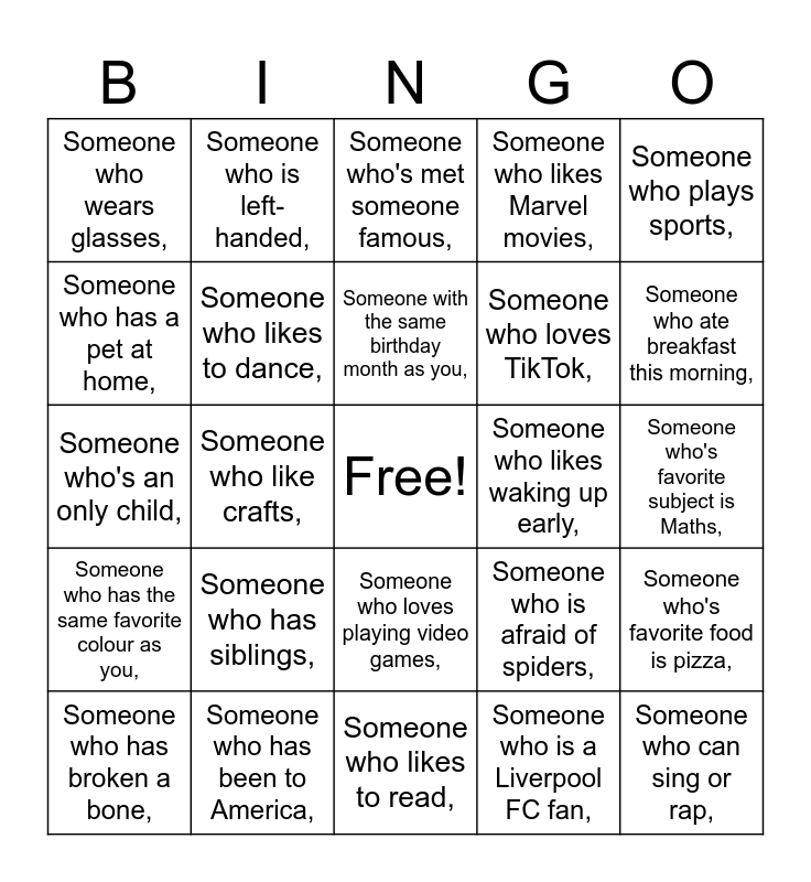 This bingo card has a free space and 24 words: Someone who has siblings,, Someone who has been to America,, Someone with the same birthday month as you,, Someone who has broken a bone,, Someone who plays sports,, Someone who wears glasses,, Someone who has a pet at home,, Someone who is left-handed,, Someone who likes waking up early,, Someone who loves playing video games,, Someone who loves TikTok,, Someone who's an only child,, Someone who is afraid of spiders,, Someone who's favorite food is pizza,, Someone who likes to dance,, Someone who is a Liverpool FC fan,, Someone who's favorite subject is Maths,, Someone who's met someone famous,, Someone who ate breakfast this morning,, Someone who like crafts,, Someone who can sing or rap,, Someone who has the same favorite colour as you,, Someone who likes Marvel movies, and Someone who likes to read,.